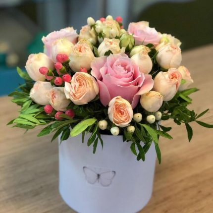 Цветы в коробке «Рассвет»( Роза Ароматная premium О Хара, Альстромерия )