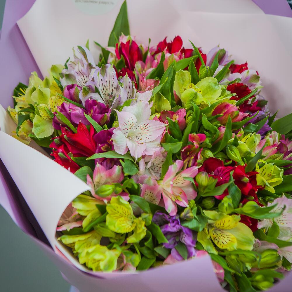 Альстромерия – 25 шт.дизайнерская упаковка и атласная лента – 1 шт.