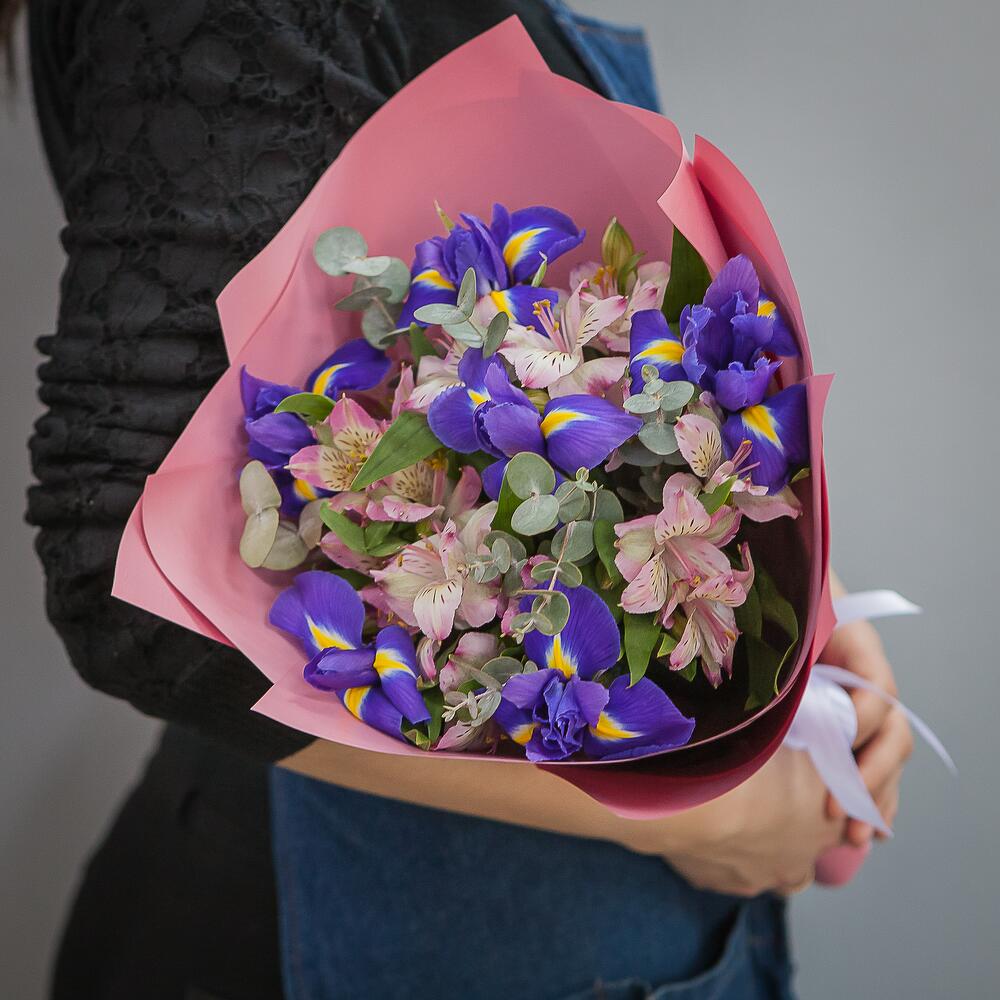 Букет из 4 розовых альстромерий и 6 ирисов с эвкалиптом