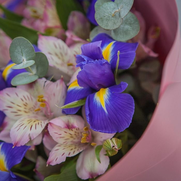 Альстромерия – 4 шт.Ирис – 6 шт.Эвкалипт – 1 шт.Матовая пленка – 1 шт.