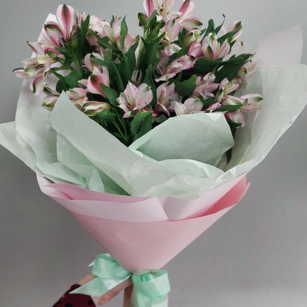 Альстромерия – 15 шт.Тишью – 2 шт.Авторская упаковка – 1 шт.Лента атласная – 1 шт.