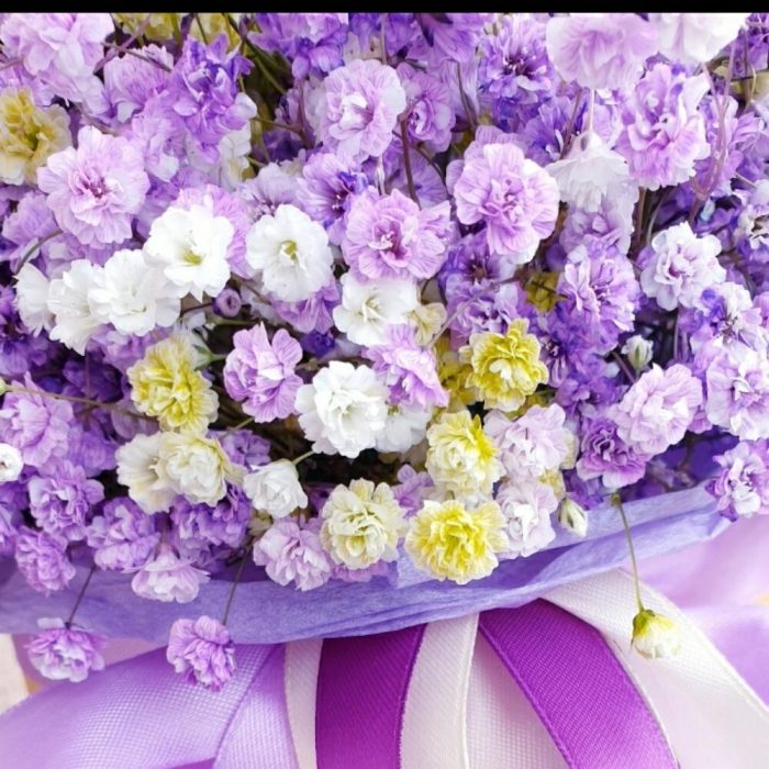 Лента атласная – 3 шт.Коробка шляпная – 1 шт.Открыточка с вашими пожеланиями – 1 шт.Оазис флористический – 2 шт.гипсофила радужная – 13 шт.любовь флориста (бесплатно) – 1 шт.тишью фиолетовое – 2 шт.