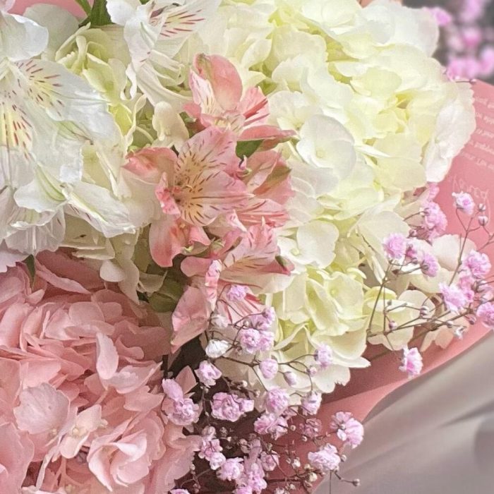 Гипсофила – 1 шт.Гортензия – 3 шт.Упаковка дизайнерская – 1 шт.Альстромерия Микс Европа – 2 шт.