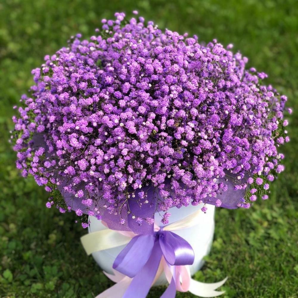 “Сиреневый туман” – композиция из гипсофилы в шляпной коробке