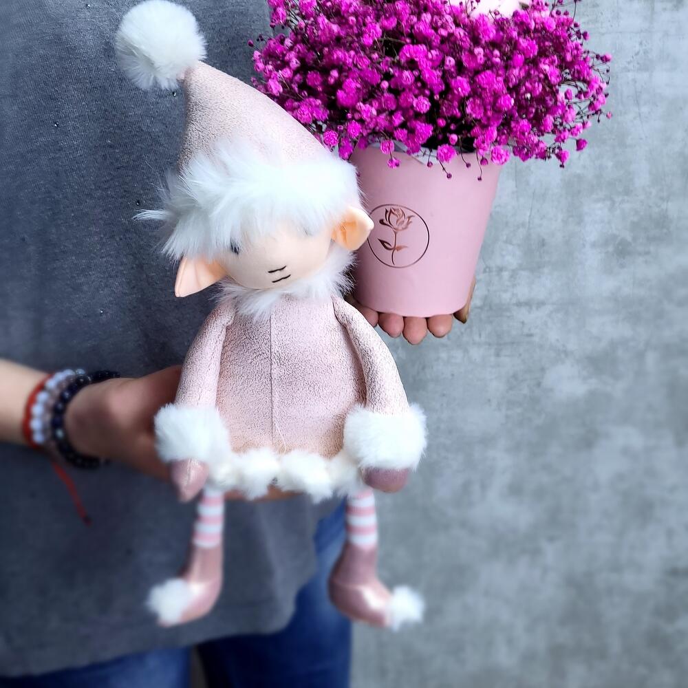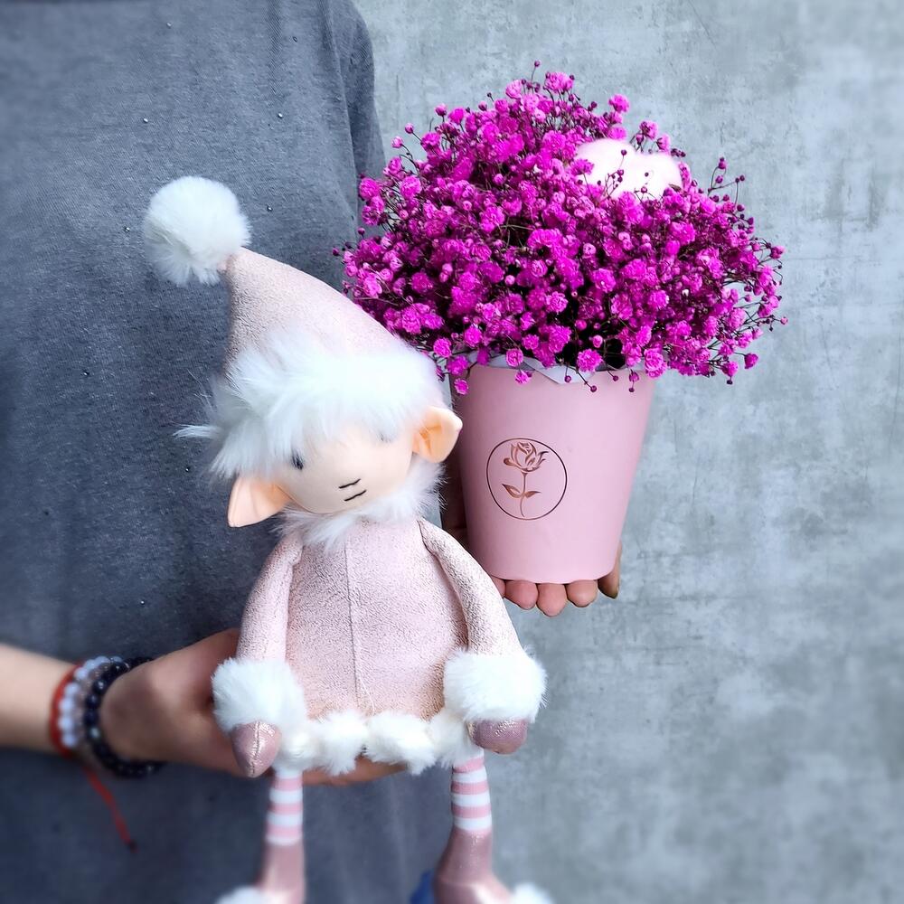 Милый эльф со стаканчиком пушистой гипсофилы