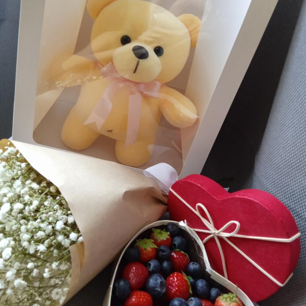Гипсофила – 3 шт.Клубника – 250 гр.Лента атласная – 1 шт.Голубика – 100 гр.Крафт упаковка – 1 шт.Пакет подарочный – 1 шт.Мишка плюшевый – 1 шт.коробка сердце маленькая – 1 шт.