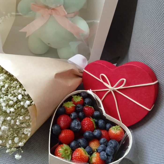 Гипсофила – 3 шт.Клубника – 250 гр.Лента – 1 шт.Голубика – 100 гр.Крафт упаковка – 1 шт.Пакет подарочный – 1 шт.Мишка плюшевый – 1 шт.коробка сердце маленькая – 1 шт.