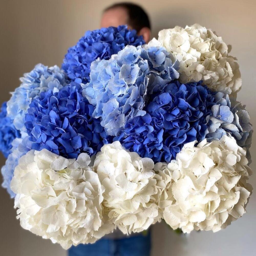 Гортензия белая – 4 шт.Гортензия голубая – 4 шт.Гортензия синяя – 5 шт.Лента атласная – 2 шт.Открыточка с вашими пожеланиями – 1 шт.хорошее настроение – 100 шт.инструкция по уходу за цветами – 1 шт.коробка переноска – 1 шт.Кризал – 1 шт.