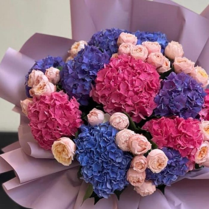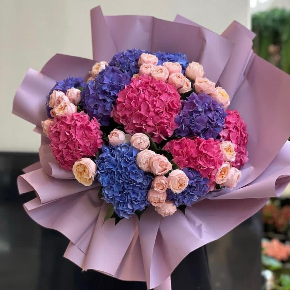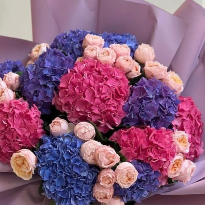 гортензия ассорти – 11 шт.пионовидные розы – 30 шт.Упаковка дизайнерская – 1 шт.Лента атласная – 2 шт.Открытка – 1 шт.инструкция по уходу за цветами – 1 шт.хорошее настроение – 100 шт.коробка переноска – 1 шт.Кризал – 1 шт.