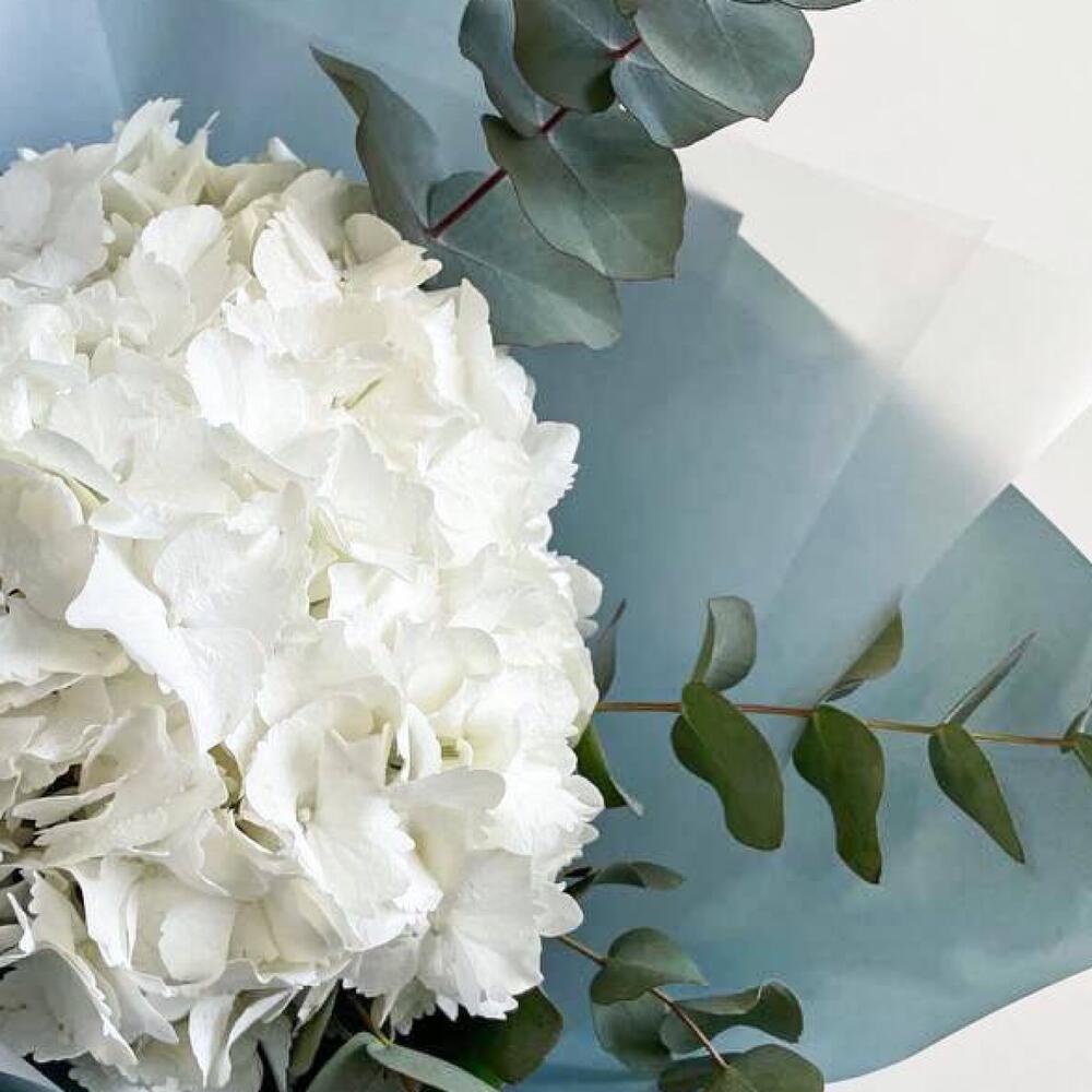 гортензия белая голландия – 1 шт.Эвкалипт Микс – 3 шт.Упаковка дизайнерская – 1 шт.транспортировочная упаковка – 1 шт.