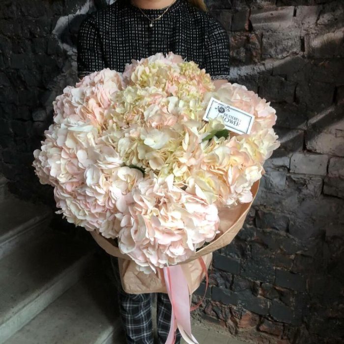 Красивый букет из 7 нежно-розовых гортензий “Суоранда”