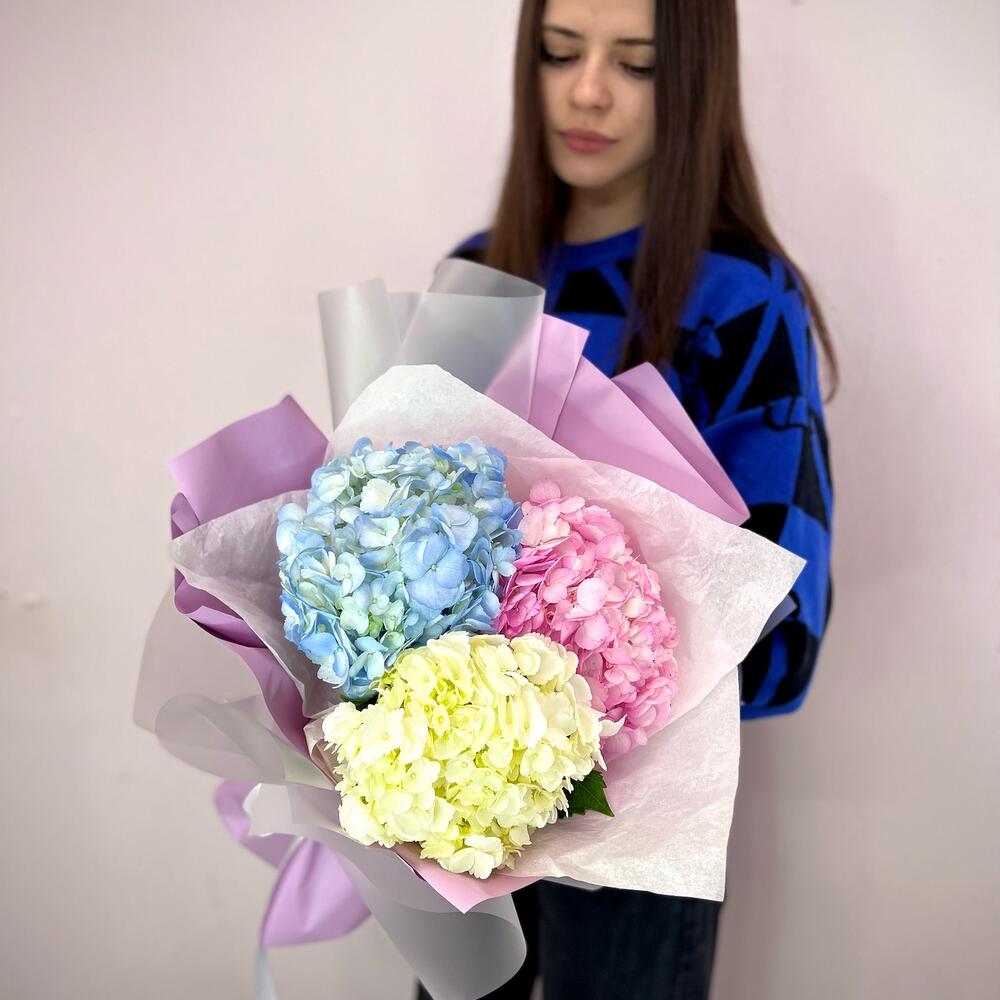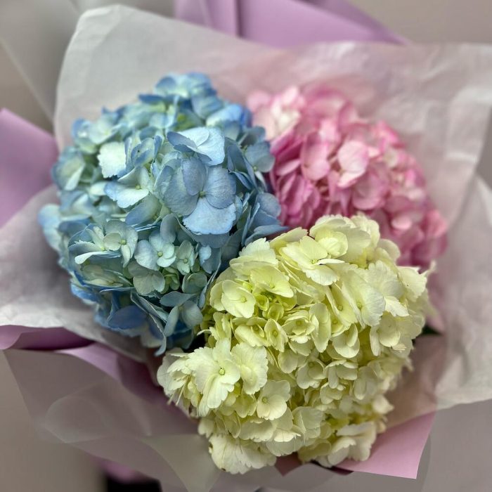 Гортензия – 3 шт.Лента атласная – 1 шт.Упаковка дизайнерская – 3 шт.