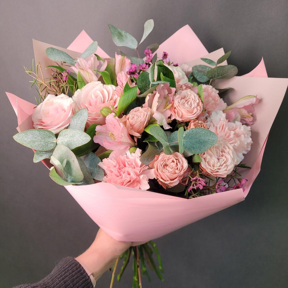 Альстромерия – 3 шт.Эвкалипт – 1 шт.Роза Эквадор – 4 шт.Лента атласная – 1 шт.Диантус – 5 шт.Хамелациум – 1 шт.Роза кустовая пионовидная – 1 шт.Упаковка дизайнерская – 1 шт.