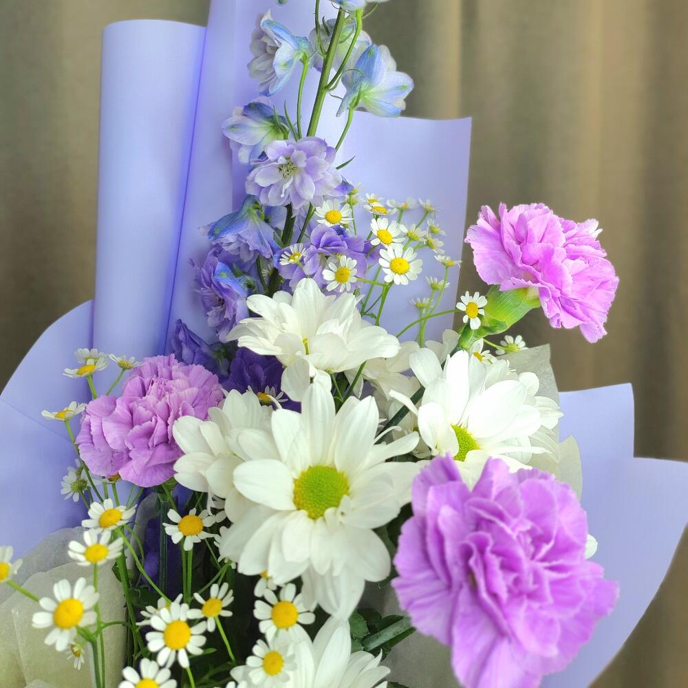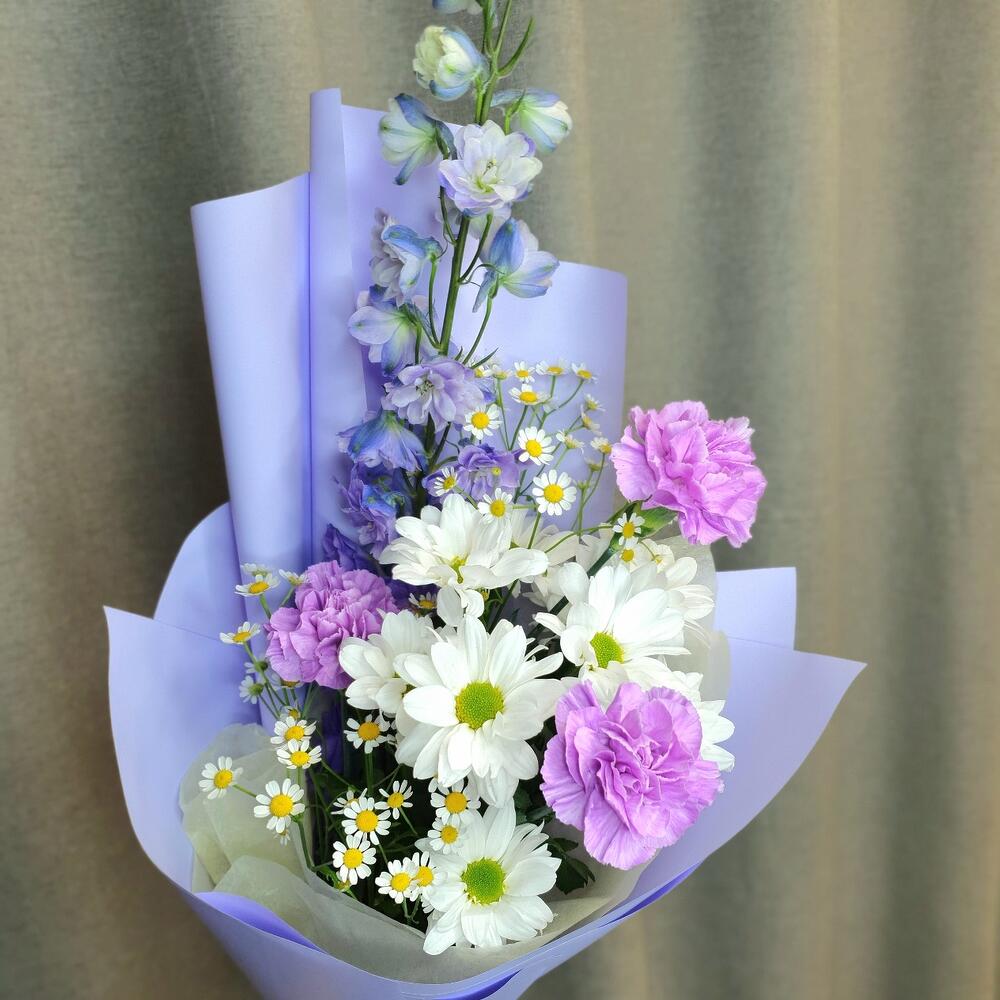 Дельфиниум – 1 шт.Матрикария (Ромашка Камила) – 2 шт.Хризантема кустовая – 1 шт.Диантус – 3 шт.