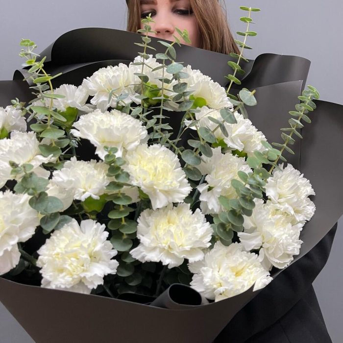 Малефисента креативный премиум монобукет из 19 белоснежных диантусов с эвкалиптом