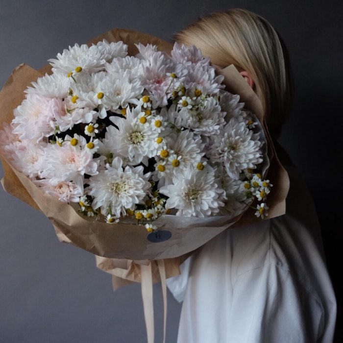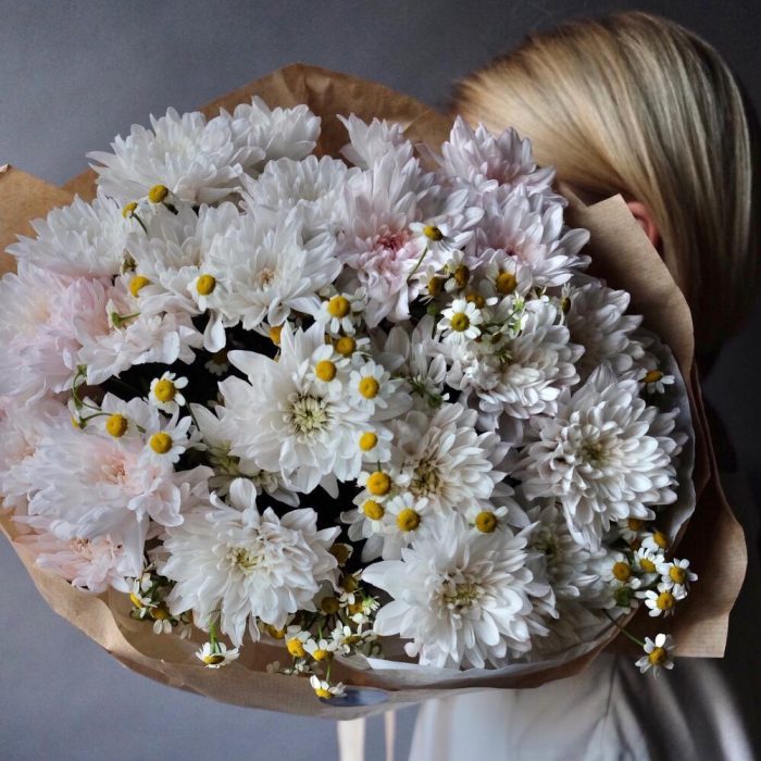 Хризантема кустовая – 5 шт.Лента атласная – 1 шт.Матрикария – 3 шт.Упаковка дизайнерская – 1 шт.Открыточка с вашими пожеланиями – 1 шт.