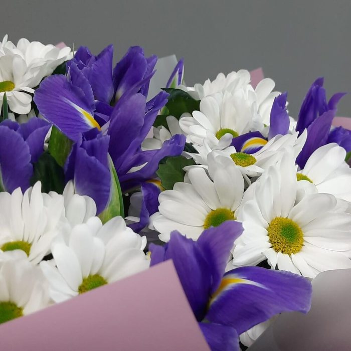Хризантема кустовая ромашковая – 5 шт.Ирис Blue Magic – 11 шт.Упаковка дизайнерская – 2 шт.