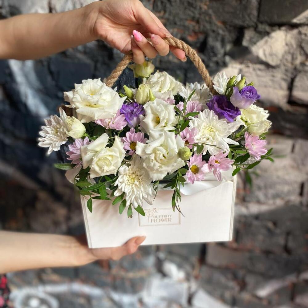 Хризантема кустовая – 2 шт.Хризантема кустовая ромашка – 1 шт.эустома белая – 2 шт.эустома сиреневая – 1 шт.Фисташка – 2 шт.Бокс деревянный – 1 шт.Оазис – 1 шт.