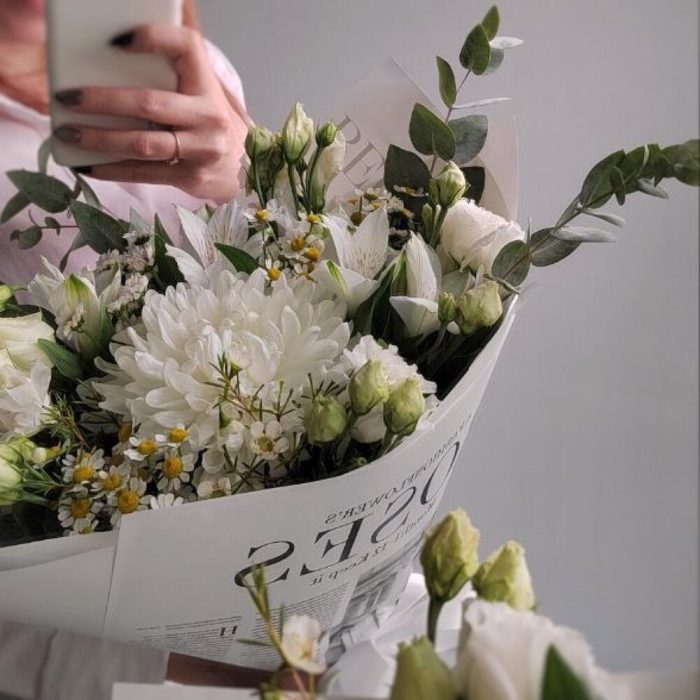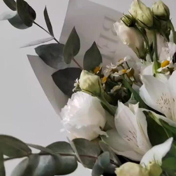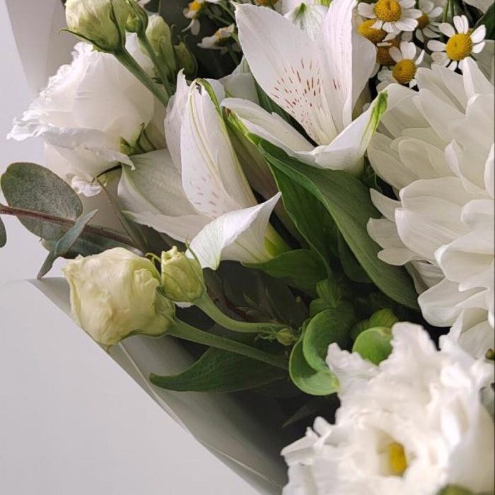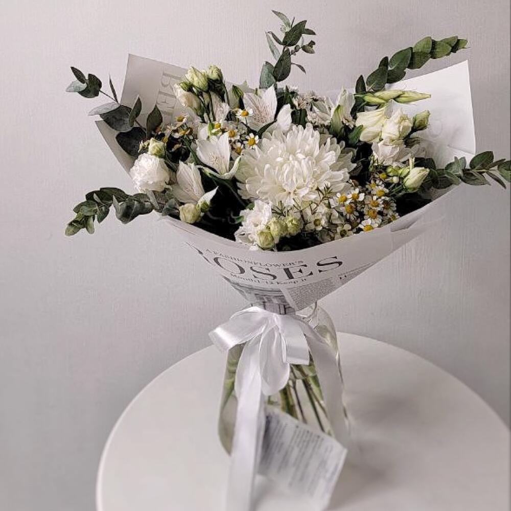 Альстромерия – 2 шт.Эвкалипт – 4 шт.Лента атласная – 3 шт.Ромашка кустовая – 3 шт.Хризантема одноголовая – 1 шт.Упаковка дизайнерская – 3 шт.эустома белая – 2 шт.