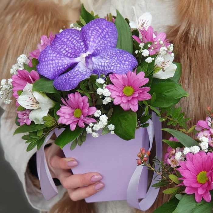 орхидея – 1 шт.Хризантема кустовая – 2 шт.Гипсофила – 1 шт.Альстромерия – 3 шт.Зелень – 1 шт.Фисташка – 1 шт.Плайм пакет – 1 шт.Оазис – 1 шт.