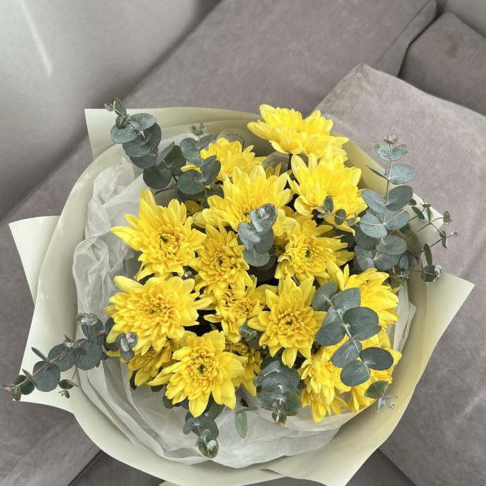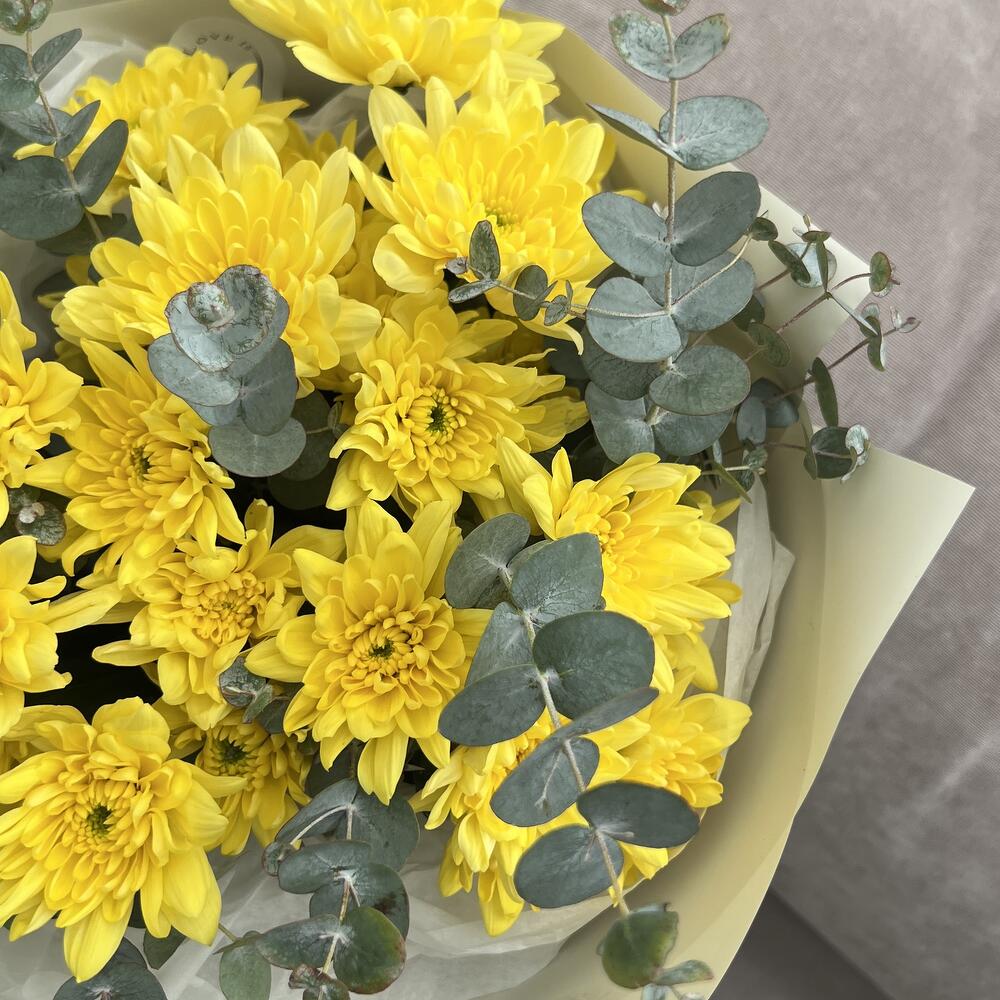 Хризантема кустовая – 3 шт.Упаковка – 1 шт.эвкалипт цинерея пучок – 1 шт.тишью белая хрустящая – 1 шт.