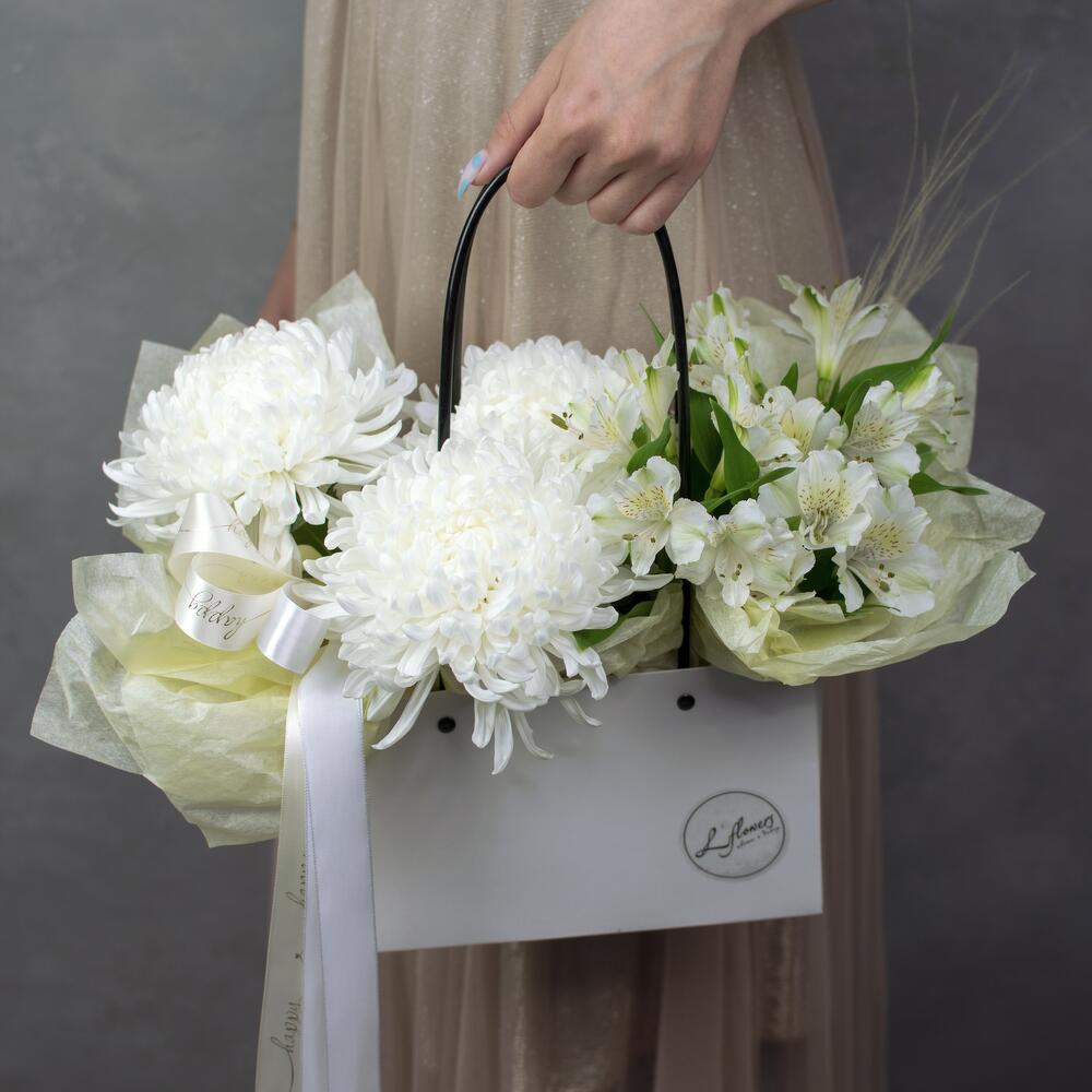 Удобная сумочка с композицией из белых цветов во флористической губке.