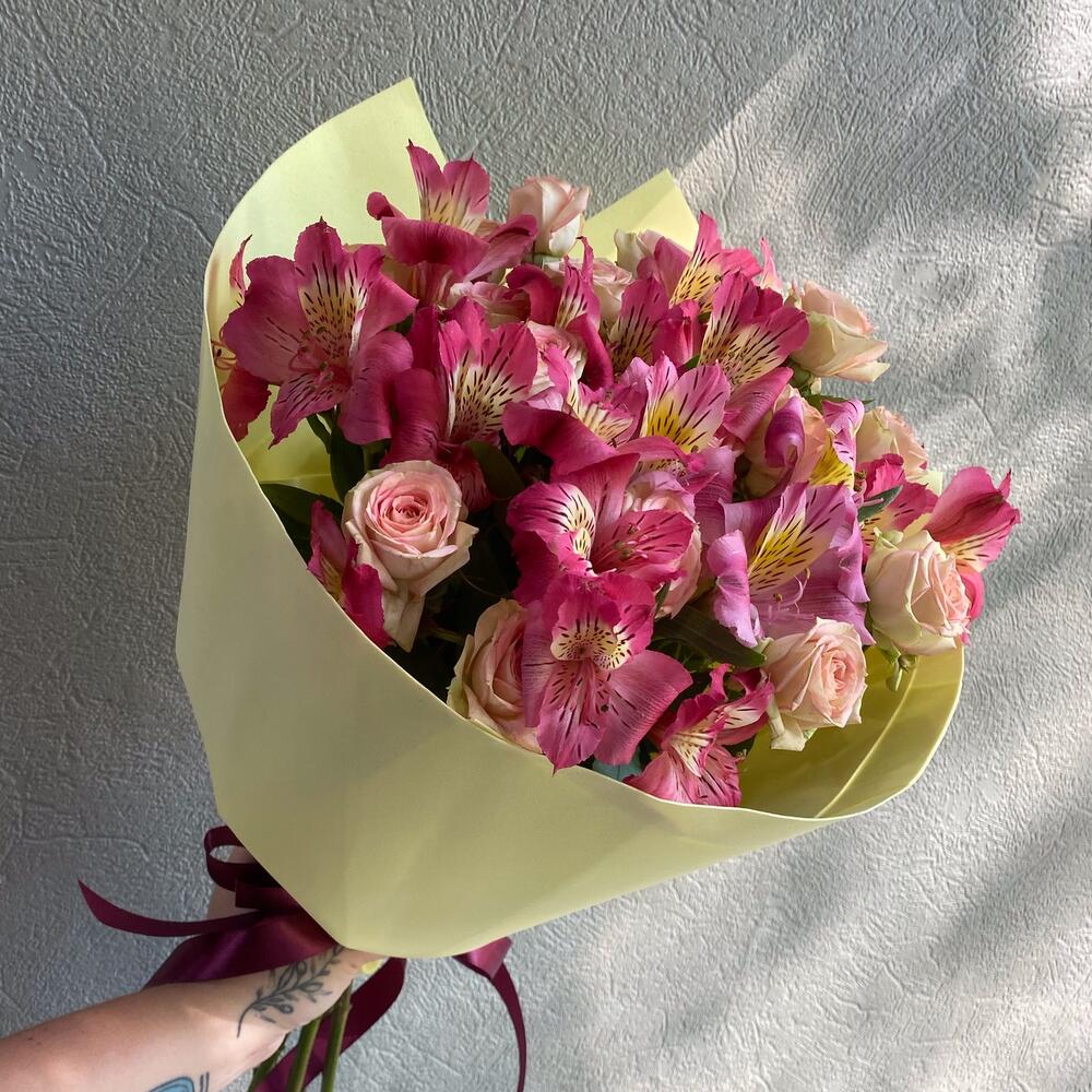 Альстромерия – 5 шт.Роза кустовая – 4 шт.Фоамиран (упаковка) – 1 шт.Лента атласная – 1 шт.