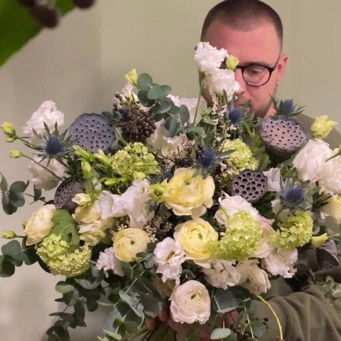 Ранункулюс – 11 шт.Лизиантус – 7 шт.Дрок – 3 шт.Хедера – 3 шт.Лотос (коробочка) – 5 шт.Колючка – 3 шт.Озотамнус – 3 шт.Колокольчик – 3 шт.Эвкалипт – 11 шт.Вибурнум – 3 шт.Лента – 1 шт.