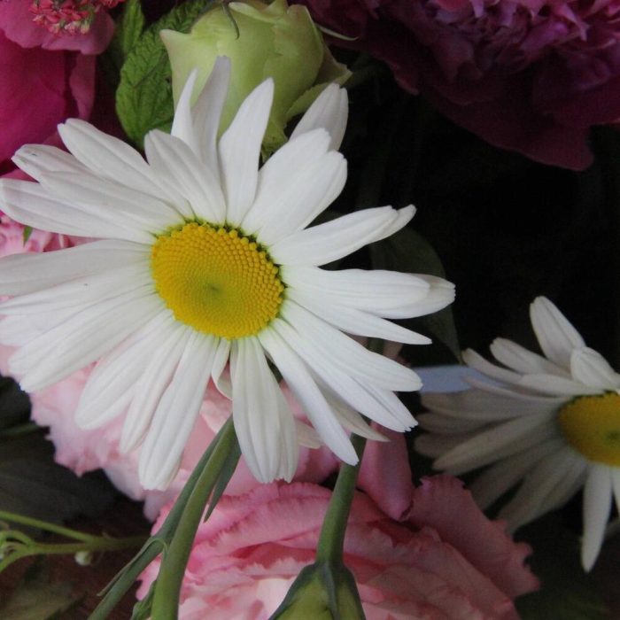 Ромашка – 3 шт.Пион – 3 шт.Львиный зев – 2 шт.Ахиллея – 1 шт.Лизиантус – 2 шт.Амми – 1 шт.Ветки малины – 3 шт.Маттиола – 1 шт.Фисташка – 2 шт.Упаковка – 1 шт.Лента – 1 шт.