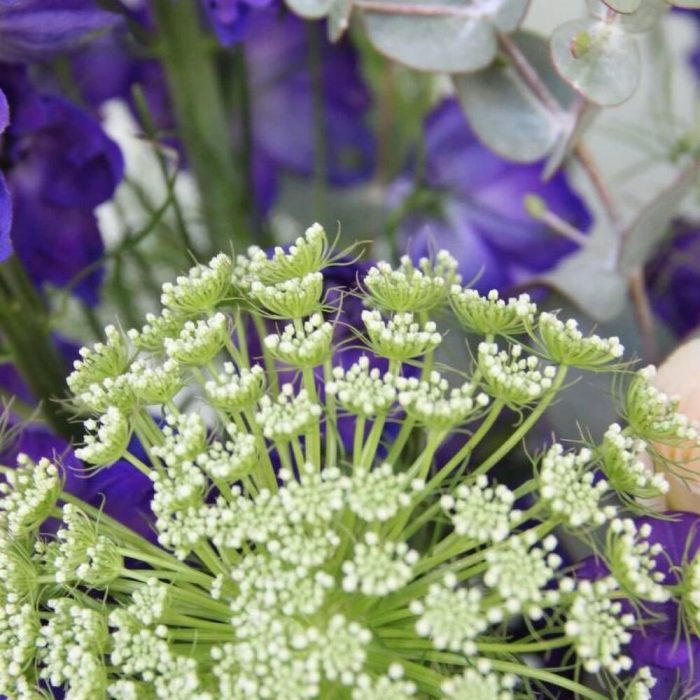 Колокольчик – 3 шт.Маттиола – 3 шт.Дельфиниум – 2 шт.Лизиантус – 2 шт.Амми – 2 шт.Эвкалипт – 5 шт.Лента атласная – 1 шт.