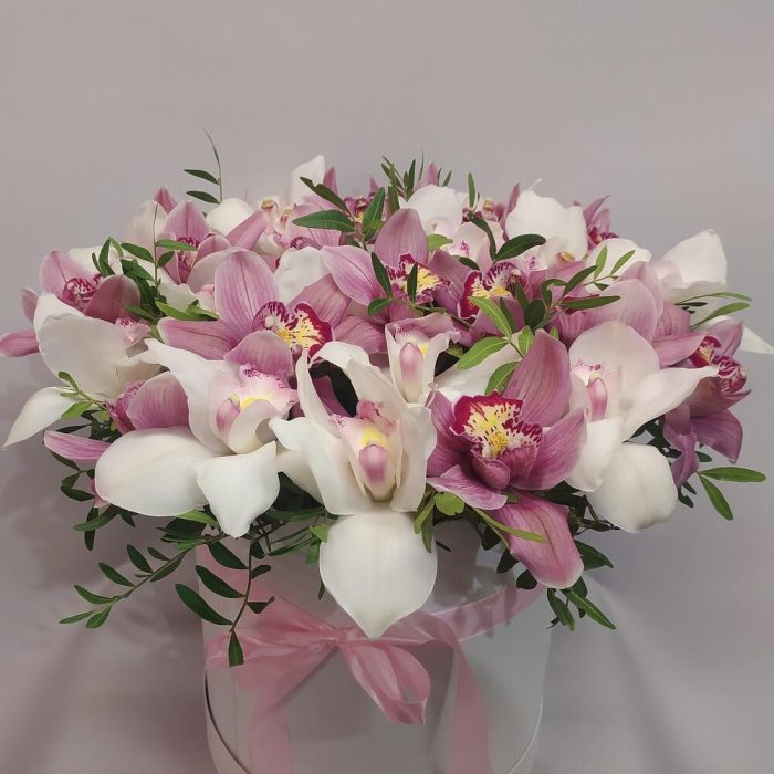 Орхидея Цимбидиум ветка – 2 шт.Коробка шляпная – 1 шт.Фисташка пучок – 1 шт.Оазис флористический – 2 шт.бант атласный – 1 шт.