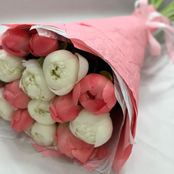 Пион Коралл Шарм (Coral Charm) – 8 шт.Упаковка – 2 шт.Лента атласная – 1 шт.Пион белый – 7 шт.