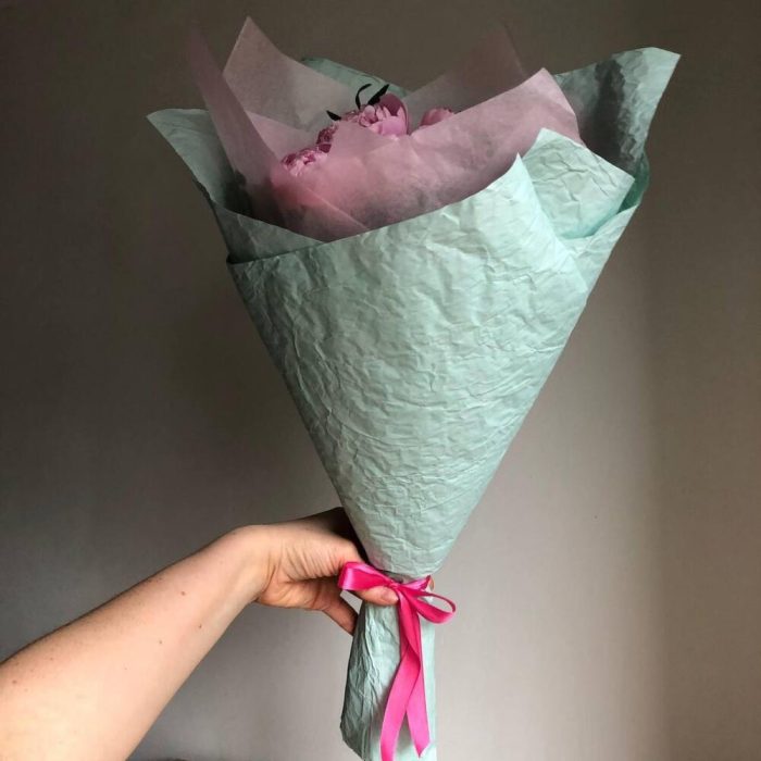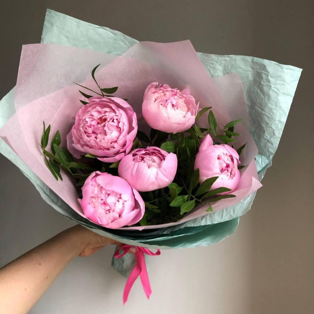 Атласная лента – 1 шт.Пион Сара Бернар – 5 шт.яркая упаковка – 2 шт.