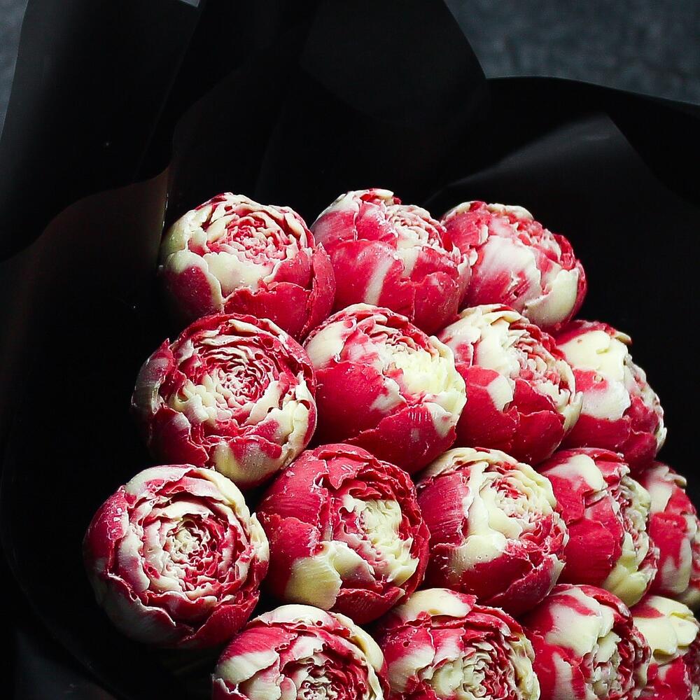 Атласная лента – 1 шт.Прозрачная пленка – 1 шт.Авторская упаковка – 1 шт.шоколадные пионы из бельгийского шоколада – 19 шт.