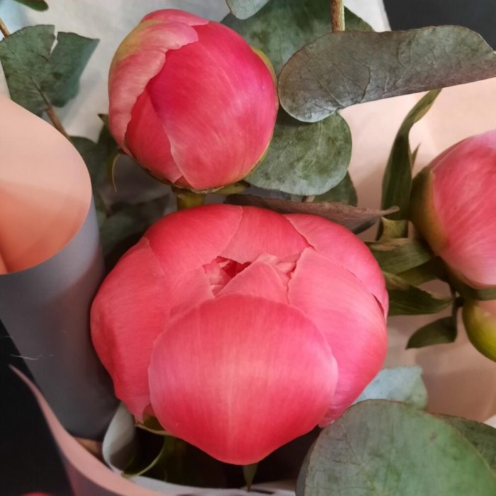 Пион Коралл Шарм (Coral Charm) – 3 шт.Эвкалипт – 1 шт.Упаковка дизайнерская – 1 шт.