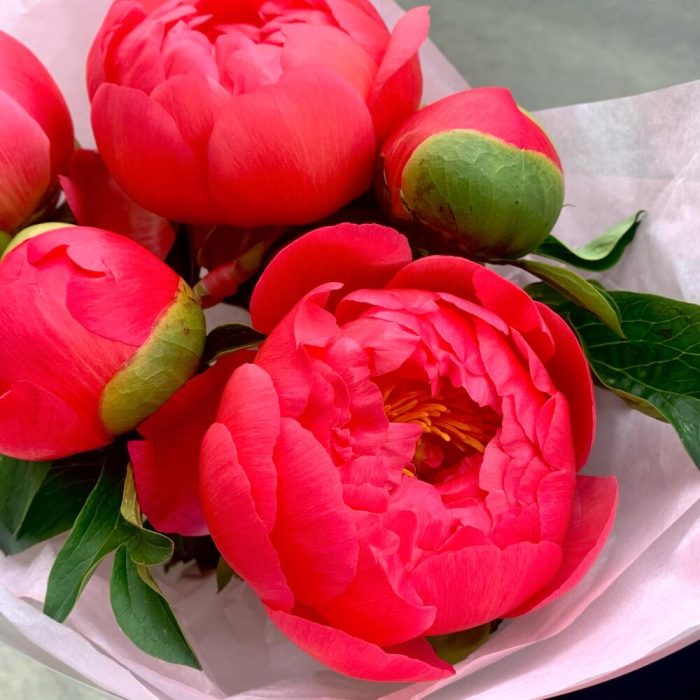 Лента – 2 шт.Пион – 5 шт.Упаковка дизайнерская – 2 шт.