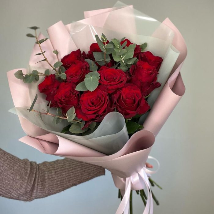 Эвкалипт – 3 шт.Лента атласная – 1 шт.Роза Эксплорер – 11 шт.Упаковка дизайнерская – 2 шт.