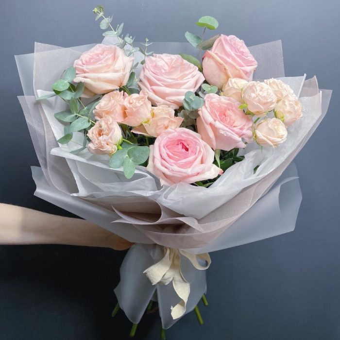 Эвкалипт – 2 шт.Упаковка дизайнерская – 1 шт.Роза пионовидная розовая – 5 шт.роза кустовая пионовидная розовая – 2 шт.