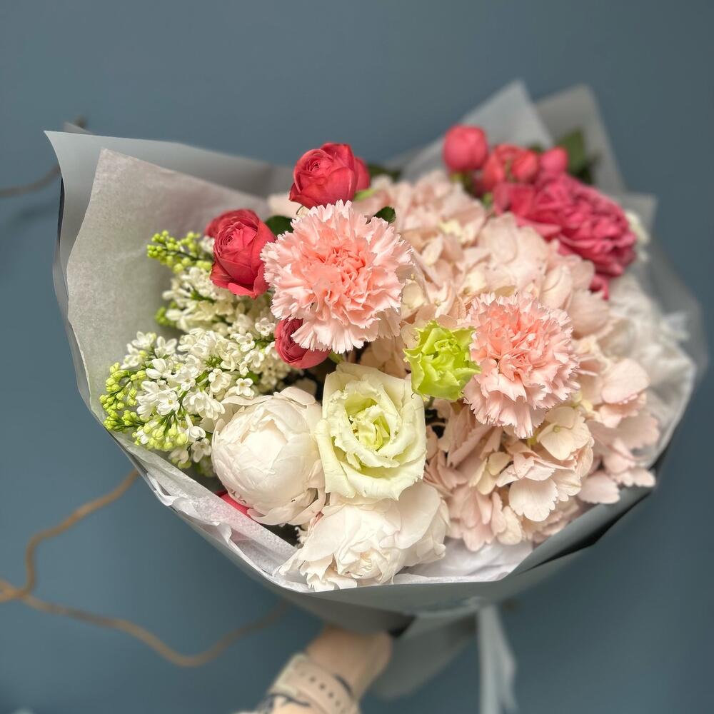 Эвкалипт – 1 шт.Сирень – 1 шт.Пион – 3 шт.роза кантри блю – 1 шт.Роза кустовая – 2 шт.Упаковка дизайнерская – 2 шт.Тишью – 3 шт.