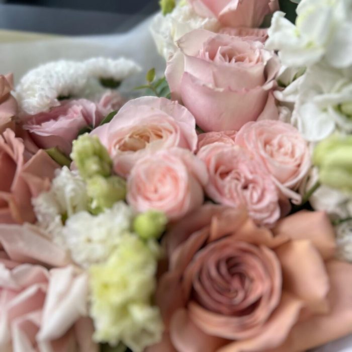 Авторский букет с сортовыми розами, ароматной маттиолой и лизиантус «Чудеса»