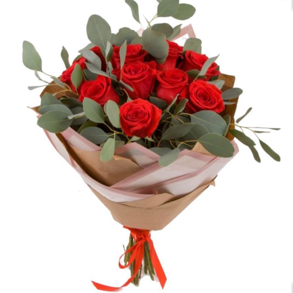 Букет из 19 красных роз и эвкалипта