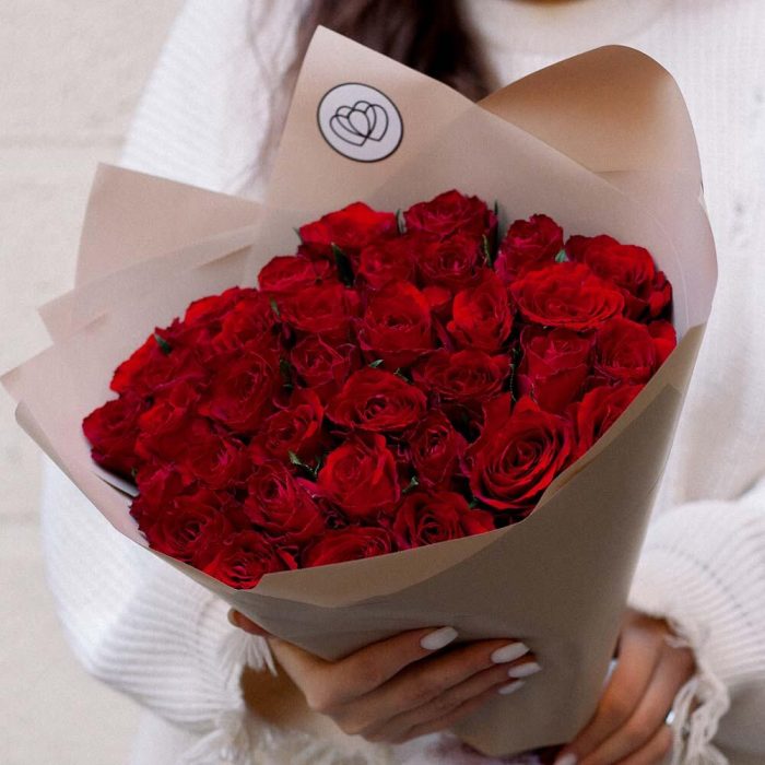 Букет из 35 красных роз (Кения) 40 см в кремовой пленке