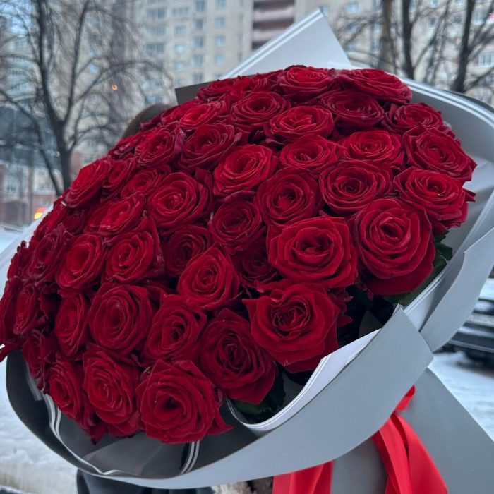 Роза красная – 71 шт.Лента атласная – 1 шт.Пленка дизайнерская – 2 шт.