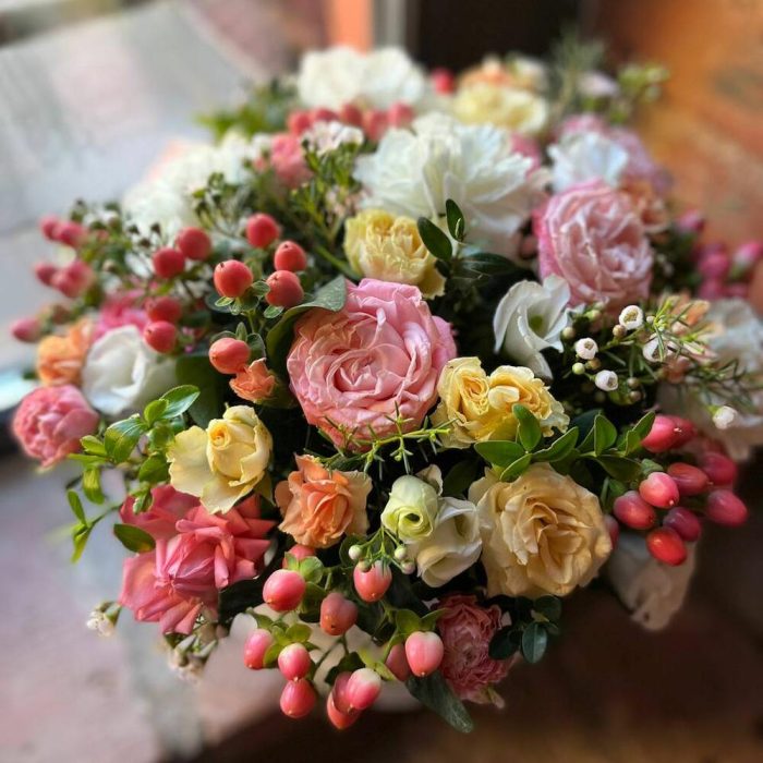 Роза кустовая – 15 шт.Гиперикум розовый – 7 шт.Гвоздика белая – 5 шт.Гвоздика кустовая желтая – 5 шт.Трахелиум – 5 шт.Хамелациум – 3 шт.Гвоздика розовая – 2 шт.Фисташка – 5 шт.Шляпная коробка – 1 шт.Оазис – 2 шт.