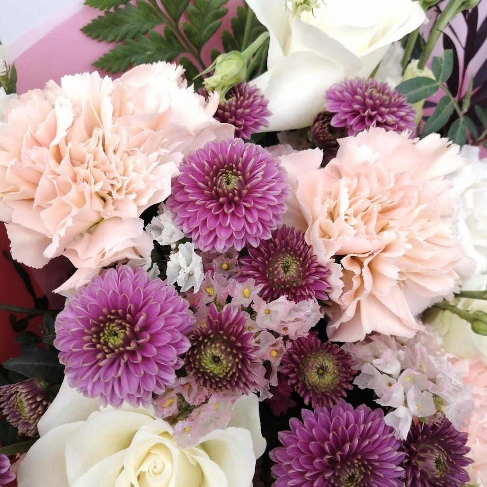 Букет из хризантем, роз, лизиантуса “Классика”