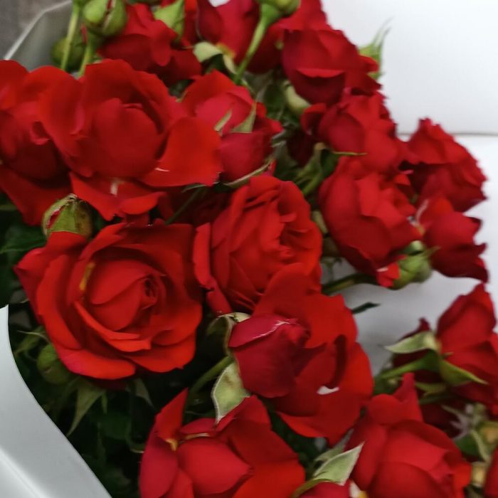Роза кустовая – 5 шт.Пленка белая – 1 шт.Лента атласная – 1 шт.