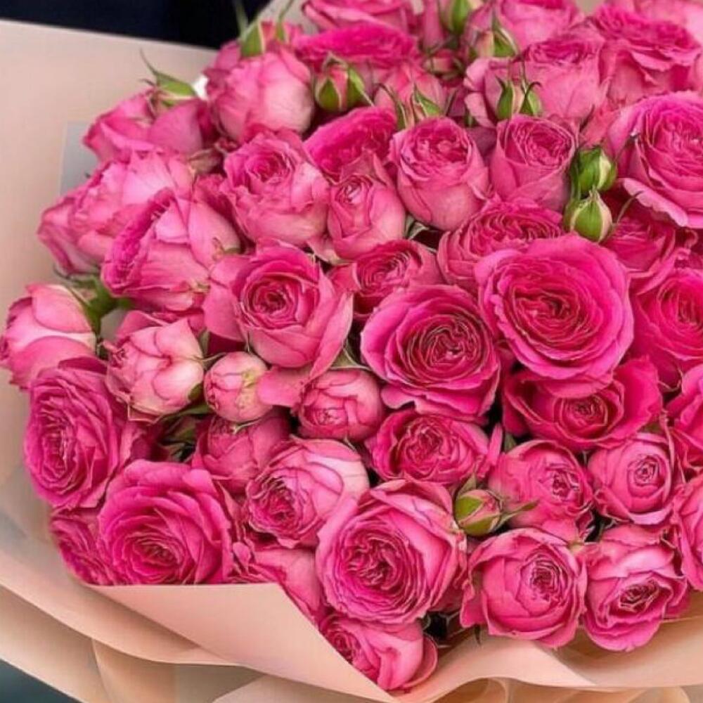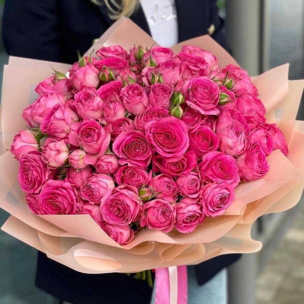 розовые кустовые розы – 51 шт.Упаковка дизайнерская – 2 шт.Лента атласная – 2 шт.Открыточка с вашими пожеланиями – 1 шт.хорошее настроение – 100 шт.инструкция по уходу за цветами – 1 шт.коробка переноска – 1 шт.Кризал – 1 шт.