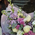 Букет из маттиолы, хризантемы и лизиантус