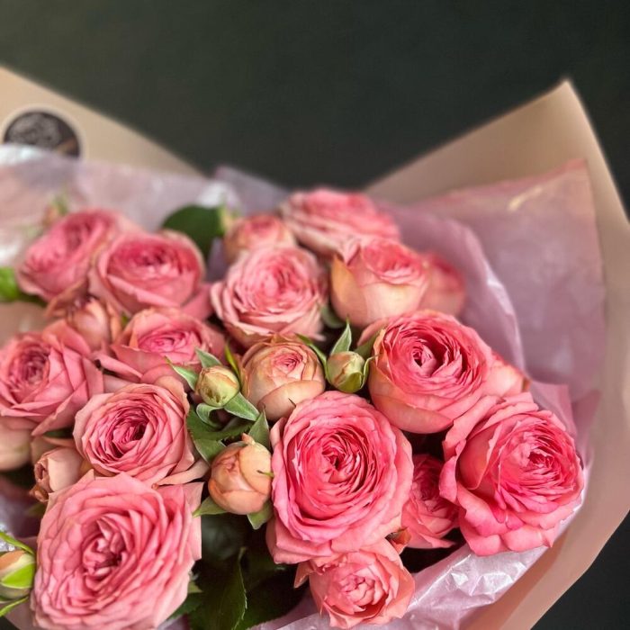 Пионовидная кустовая роза – 5 шт.декоративная упаковка – 1 шт.Атласная лента – 1 шт.