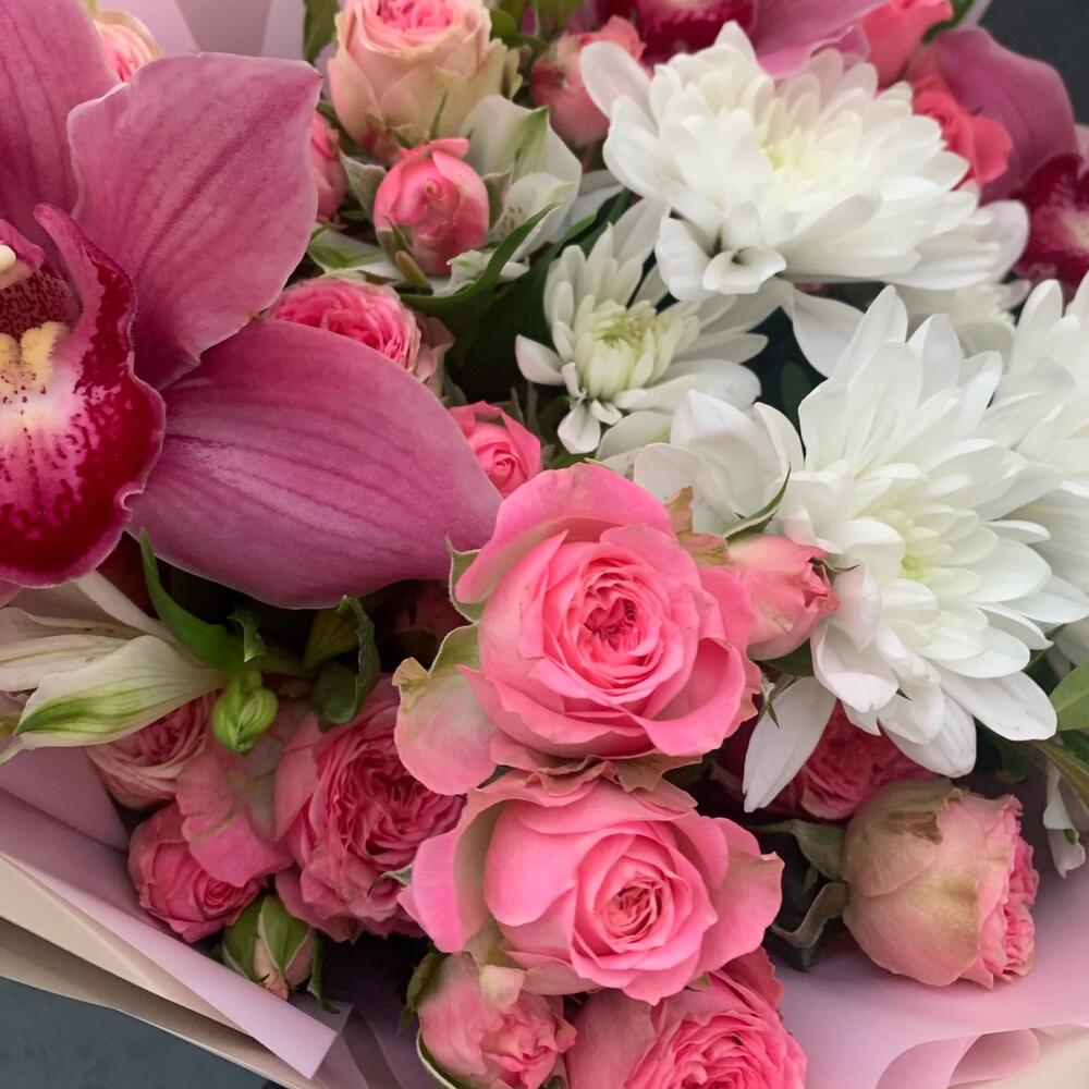 Букет из орхидей,кустовых роз,альстромерий,хризантем и зелени Каролина